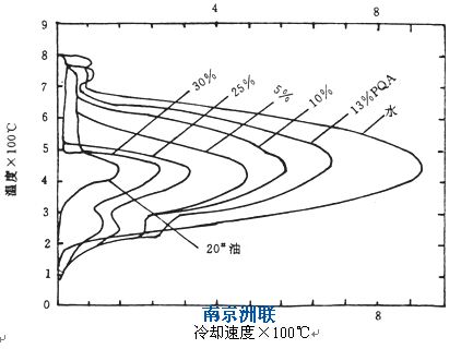 因為淬火介質濃度越大,純銀探頭的表面形成的聚合物隔膜越厚,隔熱作用越明顯,而且冷卻最劇烈的泡狀沸騰只發生在隔離膜的外表面液體 ,淬火介質不與金屬表面直接接觸,所以淬火介質的冷卻速度低。